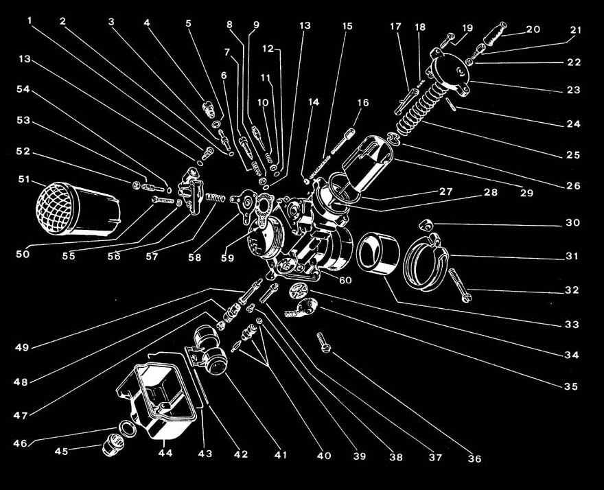 加速ポンプの調整はは(52・53)で行いネジ山部が多くなると増加しますが、